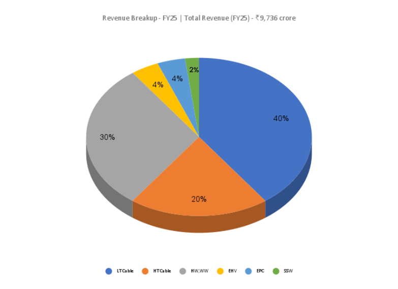 The company operates a diversified cables and EPC portfolio spanning EHV (up to 400kV), HT/LT power cables, and value-added segments such as instrumentation, control, and specialty cables (EV, solar, fire-resistant, marine and offshore). Revenue exposure is well distributed across core infrastructure and industrial end-markets, including power, oil & gas, renewables, railways, roads & highways, real estate, and telecom, providing demand visibility and reducing sector-specific cyclicality.