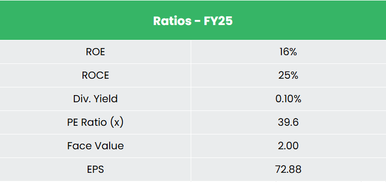 - Financial Performance – The 3-year revenue and net profit CAGR stands at 19% and 23% respectively between FY23-25. Notably, the TTM revenue and net profit growth stand at 22% and 35%. The balance sheet remains largely unencumbered, with a debt-to-equity ratio of 0.04, and the 3-year average ROE and ROCE are around 18% and 25% for FY23-25 period.
