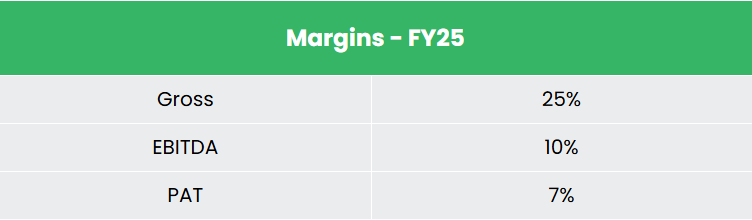 - FY25 – Consolidated net sales grew 20% YoY to ₹9,736 crore, with EBITDA at ₹1,063 crore up 20% YoY, posting a margin of 10.92%, and PAT at ₹696 crore, up 20% YoY.