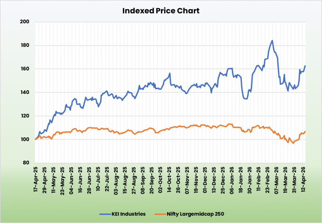 - Q3FY26 – KEI reported consolidated net sales of ₹2,955 crore, up 19.5% YoY, with EBITDA rising 39% YoY to ₹354 crore and PAT growing 42.5% YoY to ₹235 crore. EBITDA margin expanded by ~170 bps YoY to 12.0% (vs 10.29% in Q3FY25), driven by a richer product mix with the export share rising to ~18% of sales and continued traction in the retail segment.