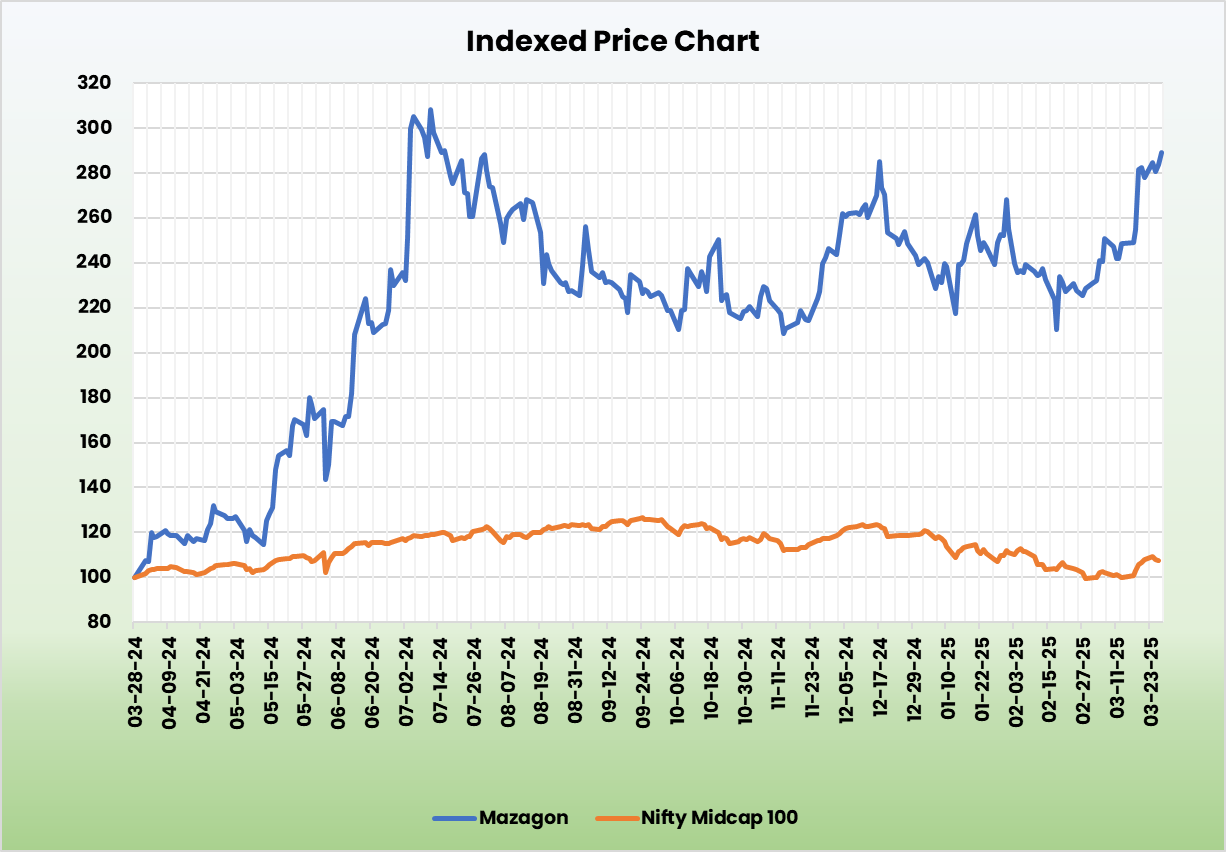 We believe MDL has strong growth potential due to its operational ties with the Government of India (GoI) and its role as a key defence public sector undertaking that manufactures warships and submarines for the Ministry of Defence (MoD). With increasing concerns about national security, the Indian defence manufacturing industry is expected to grow. Management has projected a revenue growth of 10% to 12% for FY25 and plans a capital expenditure of Rs.5,000 crore over the next few years. These planned expansions are set to nearly double the company’s capacity, allowing it to build larger vessels and take on multiple large-scale projects simultaneously. As of December 31, 2024, MDL’s order book stands at Rs.34,787 crore. Additionally, the company’s focus on indigenization has led to reduced construction costs, a trend expected to continue, resulting in stable profit margins and earnings.