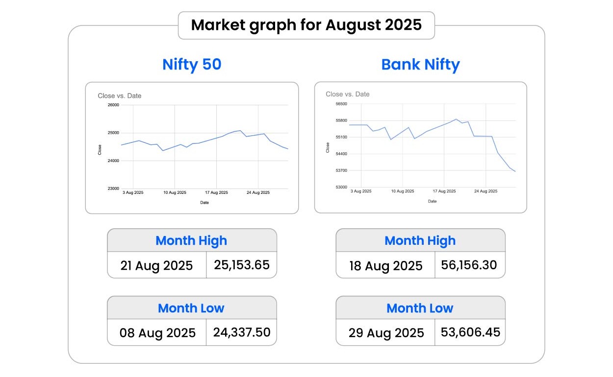 In August 2025, the Nifty 50 and Bank Nifty continued their downward trend from July, declining by 1.38% (341 points) and 4.12% (2,306 points) respectively, with the Bank Nifty underperforming significantly. The major factor for this market decline was the U.S. President’s announcement and subsequent implementation of a 50% tariff on Indian exports on August 27, which triggered a sell-off and pushed the Nifty below the 24,500 level. Although the Nifty briefly rallied above 25,000 in the second week of the month on GST reform news, it failed to sustain this level.