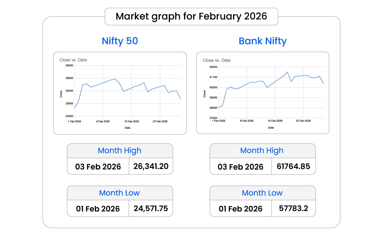 In February 2026, the Nifty 50 declined 0.56% (142 points) and closed below the 200-day EMA after reclaiming it in March 2025. Bank Nifty outperformed, rising 1.54% (918.55 points). Sentiment weakened early as markets fell nearly 2% on Budget day after the increase in F&O STT charges. Optimism over a potential US–India trade deal later triggered a sharp 2.5% single-day rebound, making February highly volatile. Despite this, selling pressure persisted at higher levels with 26,000 acting as a key resistance. The RBI kept the repo rate unchanged at 5.25%, raised FY26 GDP growth to 7.4%, and projected FY27 inflation at 4.0–4.2%. GST collections for February rose 8.1% YoY to ₹1.83 lakh crore. In the cash segment FIIs sold ₹6,641 crore, while DIIs bought ₹38,423 crore.