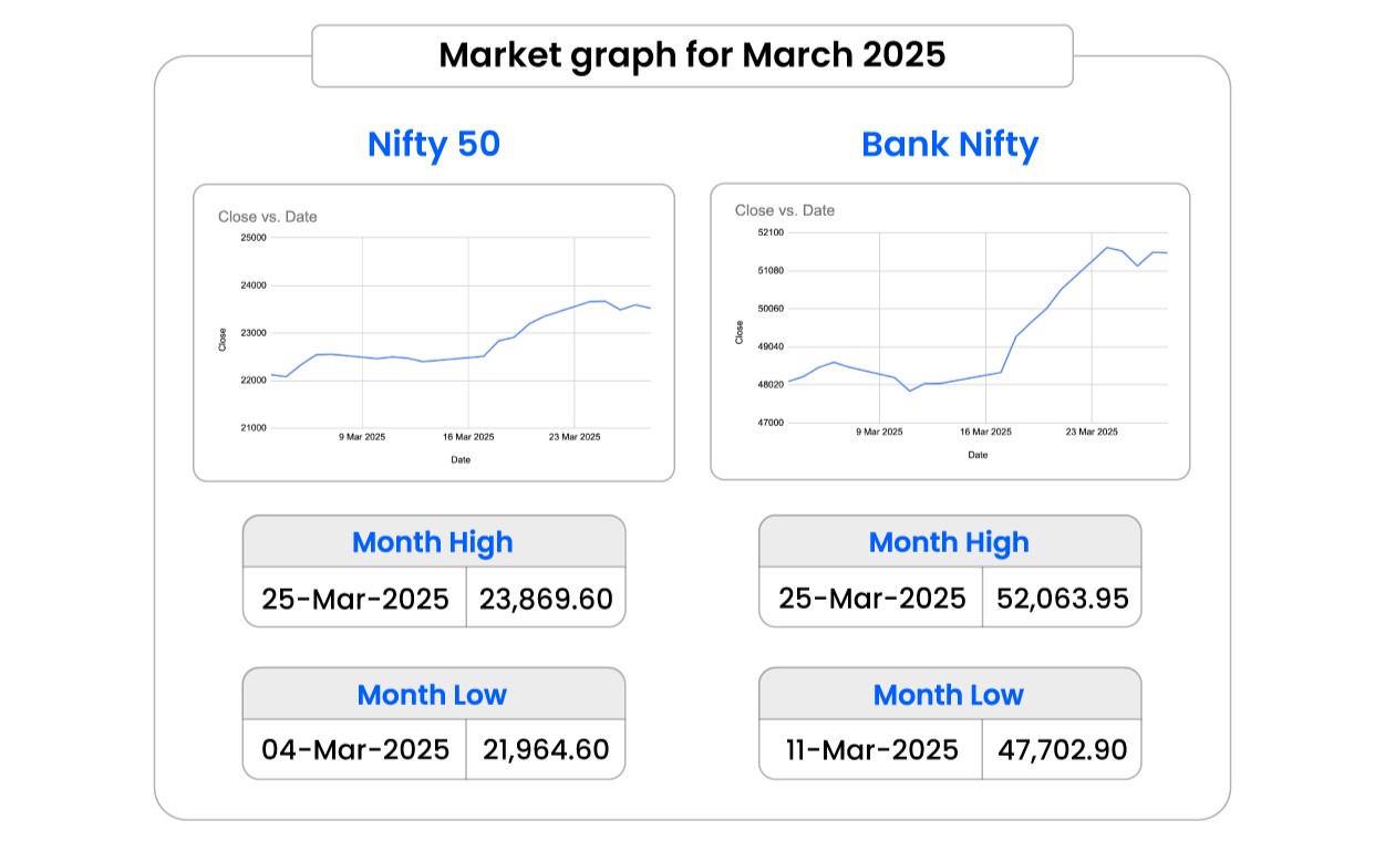 In March 2025, the Nifty 50 closed its five-month losing streak with a strong rebound, surging 6.3% (1,394 points). Bank Nifty also saw a notable rise of 6.66% (3,220 points). This marked the Nifty 50 index’s best monthly gain in 15 months, helping the domestic benchmark recover from its prolonged downturn and close FY25 with an overall gain of 5.3%, while Bank Nifty delivered a 9.4% gain.
