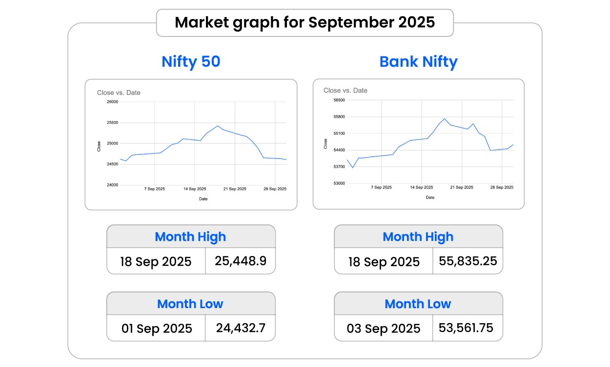 In September 2025, the Nifty 50 and Bank Nifty snapped their two-month losing streaks, gaining 0.75% (184 points) and 1.83% (980 points) respectively, with Bank Nifty clearly outperforming. The month was a roller coaster, Nifty rallied nearly 1,000 points in the first half to hit a high of 25,448 on September 18, before slipping into an eight-session losing streak that erased most of those gains.