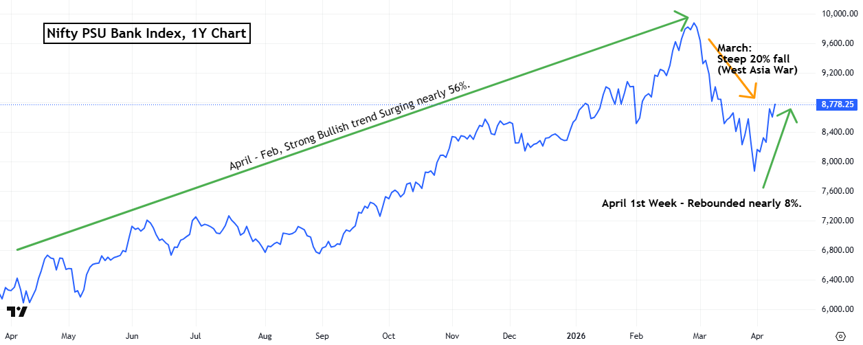 From April 2025 to February 2026, the Nifty PSU Bank Index maintained a strong bullish trajectory, rallying nearly 56% with a consistent pattern of higher highs and higher lows. The trend faced a sharp interruption in March 2026, with the index correcting nearly 20% amid escalating West Asia tensions. The decline was further worsened by macro pressures, as the 10-year government bond yield surged above the 7% mark, creating MTM pressure on PSU banks, while the Indian Rupee weakened to a historic low of ₹95. Despite this, the broader structure remained intact. In April 2026, the index rebounded nearly 8%, indicating renewed buying interest and suggesting the correction was a healthy pullback within an ongoing uptrend.