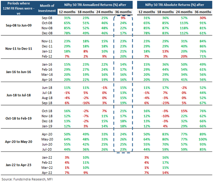 Negative FII 12M flows have historically been followed by strong equity returns over the next 2-3 years (as FII flows eventually come back in the subsequent periods). In the table below we can see the Nifty 50 TRI annualised returns for 2-3 years period after every period of FII negative flow.