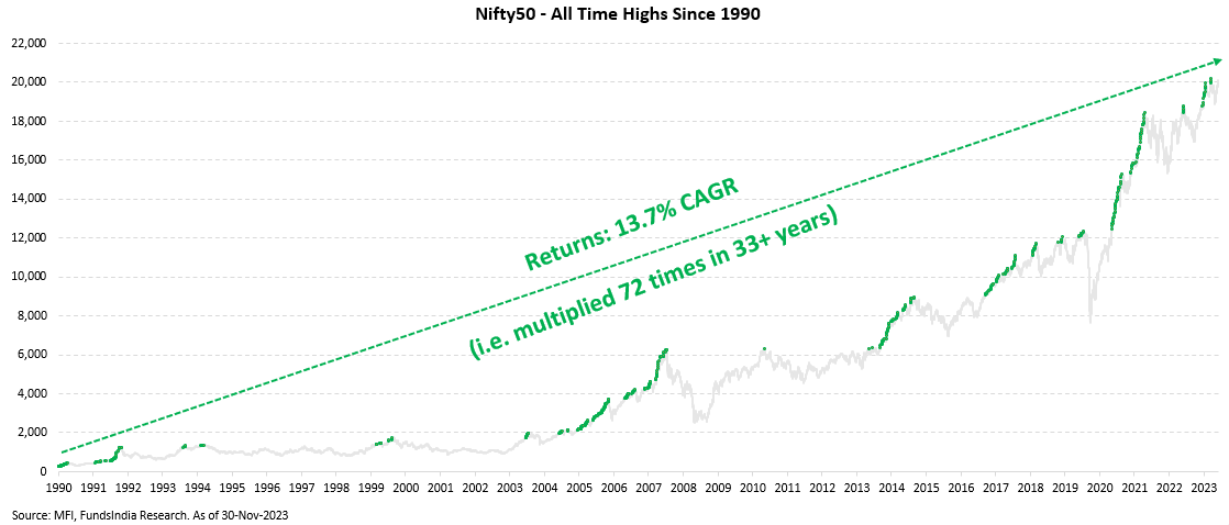 This clearly shows that “all-time highs” automatically don’t imply a market fall and in fact, the majority of times, market returns have been strong post an all-time high.