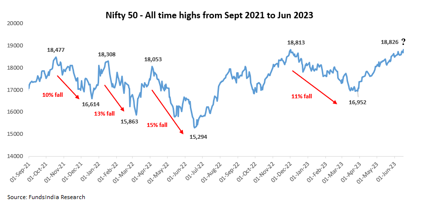 As seen above, the Nifty 50 between 2021 and 2022 hit all-time high levels (around 18,000 levels) four times in Oct-21, Jan-22, Apr-22 and Dec-22. In all these instances, Nifty 50 fell 10% to 15% after that.