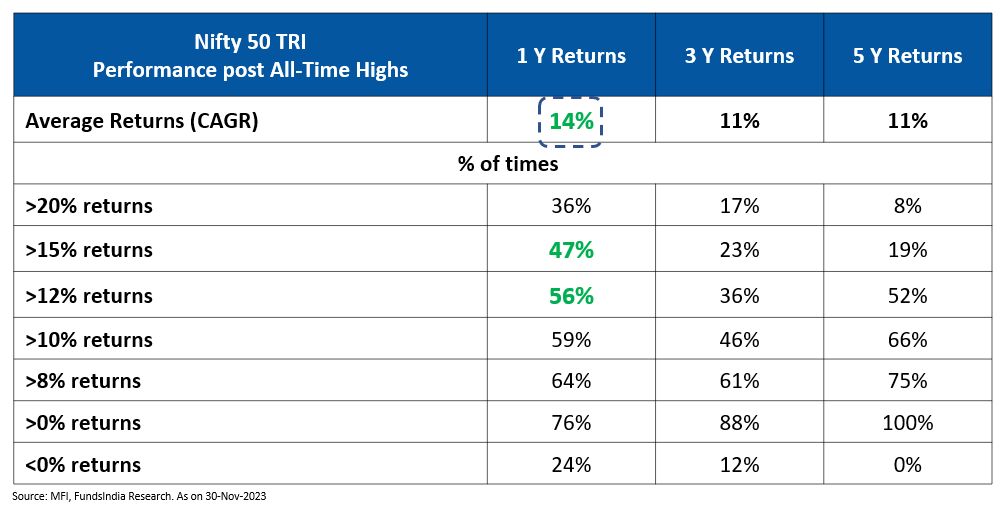 For the last 23+ years, we checked for all the periods where Nifty 50 TRI hit an “all-time high”. We then checked the 1-year, 3-year, and 5-year returns following those “all-time high” levels.