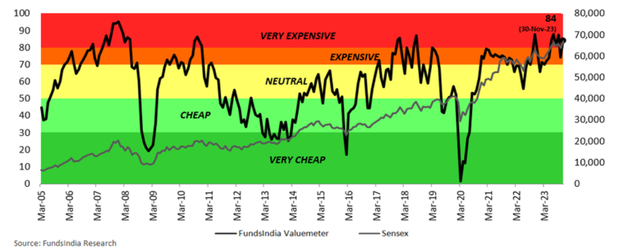 Our in-house valuation indicator FI Valuemeter based on MCAP/GDP, Price to Earnings Ratio, Price To Book ratio, and Bond Yield to Earnings Yield indicates the value of 84 i.e. Very Expensive Zone (as of 01-Dec-2023).