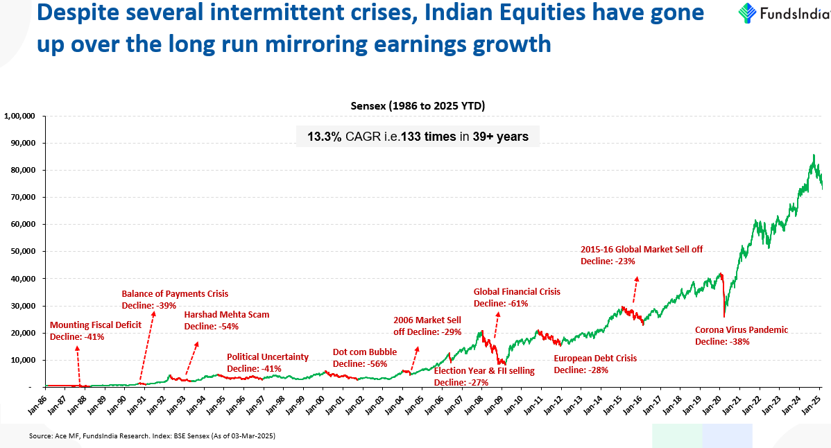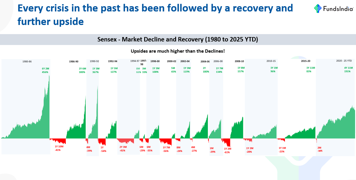 These sharp declines have also been temporary, as the Indian equity markets have consistently recovered and moved upward over the long run, driven by earnings growth.