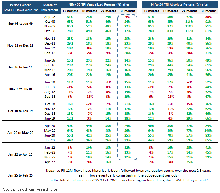 - Negative FII 12M flows have historically been followed by strong equity returns over the next 2-3 years (as FII flows eventually come back in the subsequent periods).