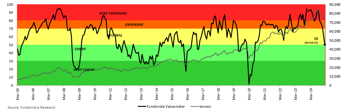 - Our in-house valuation indicator FI Valuemeter based on MCAP/GDP, Price to Earnings Ratio, Price To Book ratio and Bond Yield to Earnings Yield has reduced from 64 last month to 50 (as on 28-Feb-2025) – and is in the ‘Neutral’ Zone