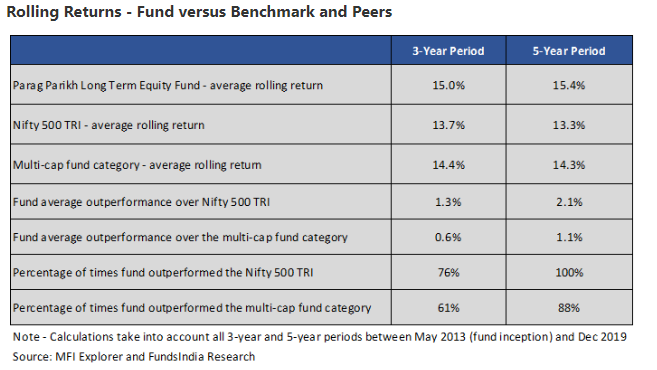 Parag Parikh Long Term Equity Fund has outperformed the Nifty 500 TRI and also its peer funds over the 3-year and 5-year periods on a rolling-return basis. For instance, over a 5-year period, the fund has beaten the benchmark 100% of the times with the average outperformance being 2.1% points.