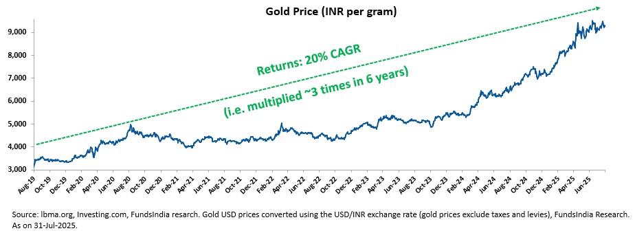 Gold has witnessed a sharp rally over the last 6 years (2019-2025), gaining ~20% annually and nearly tripling!