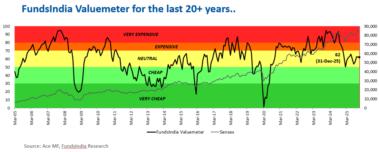 The FundsIndia Valuemeter is our in-house valuation model which tells us if the market is cheap or expensive by evaluating four key valuation parameters.