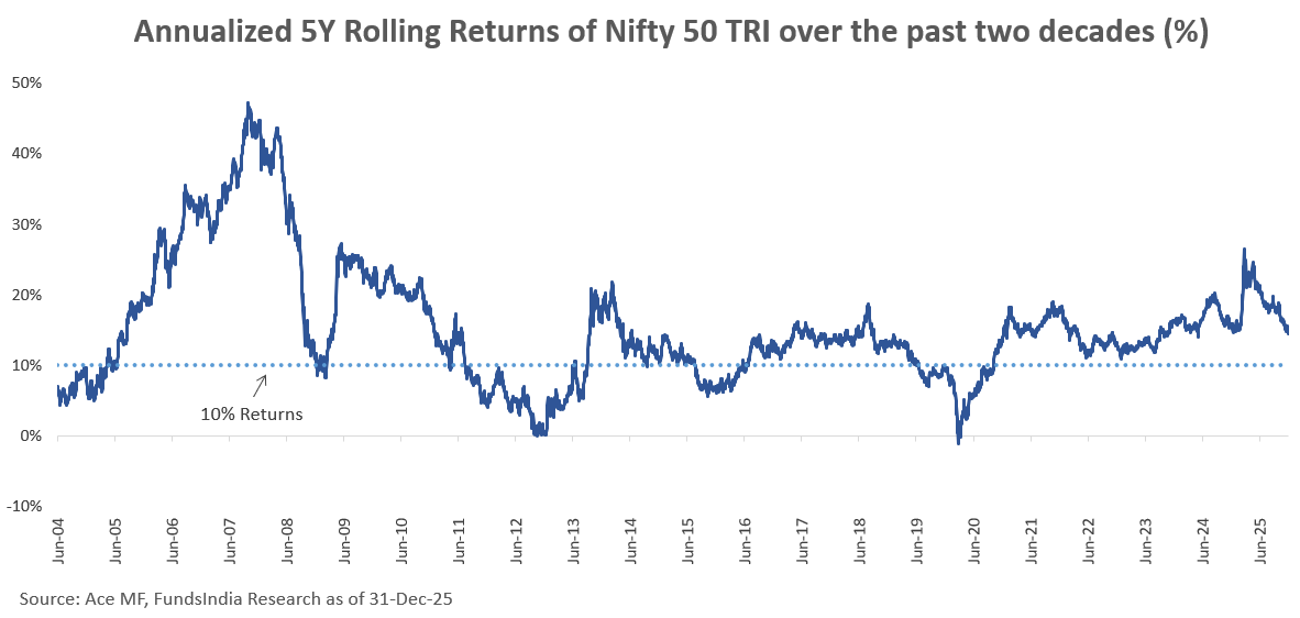 - Even in instances where 5Y returns fell below 10%, the returns recovered back to >10% CAGR, in the next 1-2 years