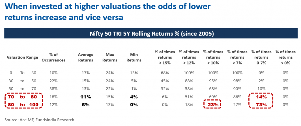 - When starting valuations were in the VERY EXPENSIVE zone (i.e Valuemeter >80), 73% of the times the 5-year future returns have been less than 7%. Just 23% of the times, returns were above 10%.