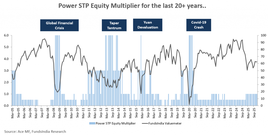 When valuations are cheap the Power STP allocates three or six times the monthly installment into equities, meaning the whole amount gets deployed into equities quickly within 2 to 4 months.