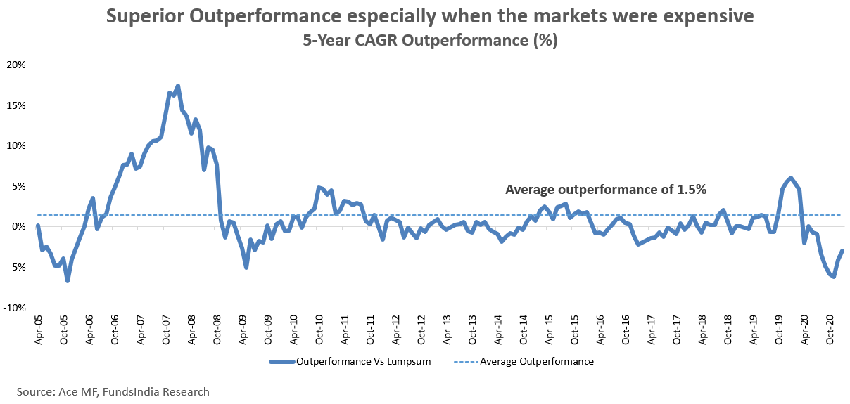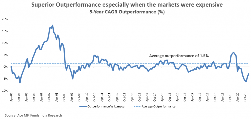 - Average outperformance of 1.5% vs lumpsum on a 5 year rolling basis