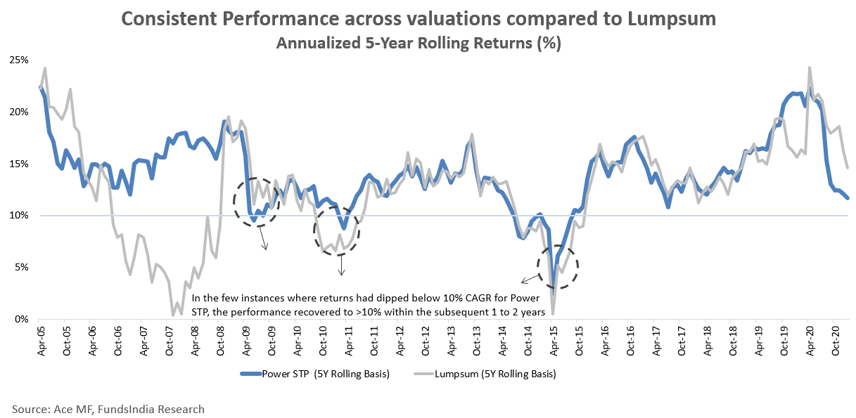 - The Power STP may underperform lumpsum in the initial 1-3 years as it usually takes 1-2 years to deploy the money when market valuations are expensive.