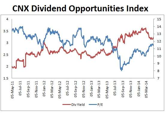 As a result, the dividend yield of the CNX Dividend Opportunities Index, at 3.22% is higher than it was 3 years ago and has only marginally declined from 3.24% in August 2013, despite the swift market rally from September 2013 till date.