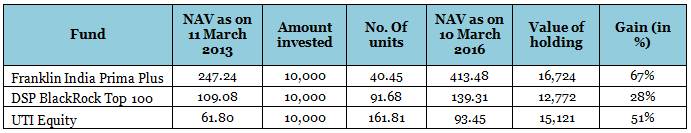 Here is an example. Look at the table below. You have three funds, all with different NAVs. Let’s say you put Rs 10,000 in each, three years ago. You have the highest number of units in UTI Equity and the least in Franklin India Prima Plus. If you used the logic that lower NAVs are better because its cheaper, UTI Equity should have been your best bet. But look at the value of the holding at the end of the three years and the absolute gain you made on each of the funds.