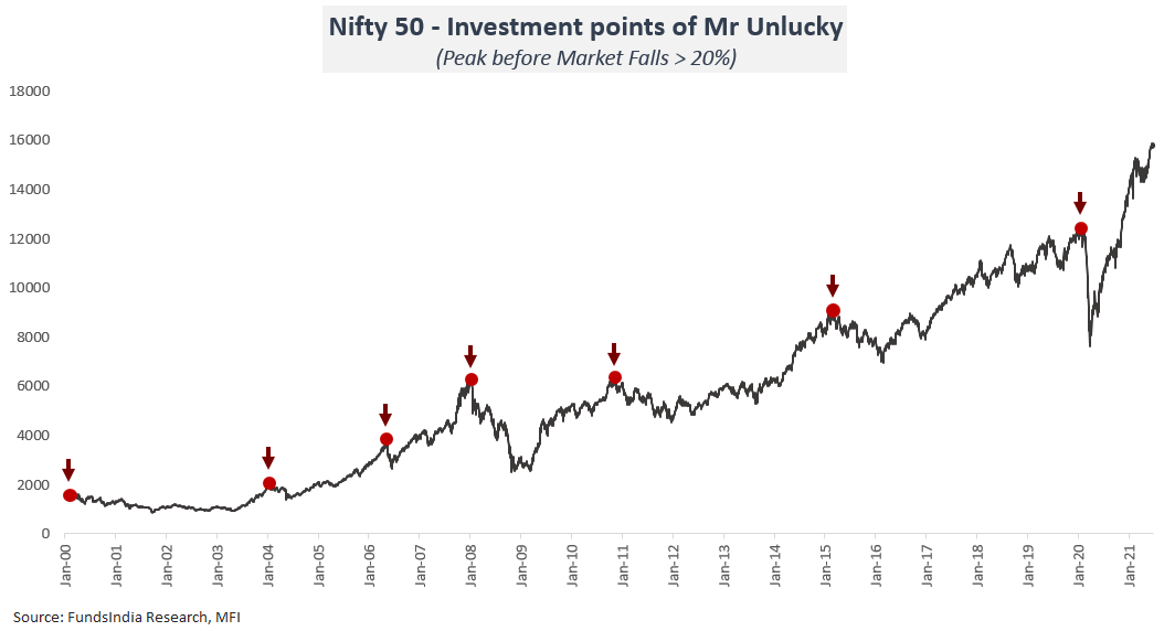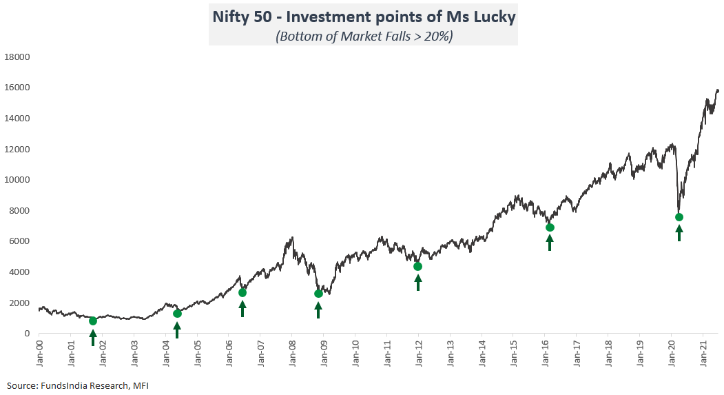 Ms Lucky – Always invests in equity at the bottom of a market fall