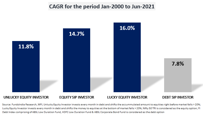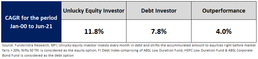 So they keep accumulating their savings in a debt fund every month, and they deploy their entire accumulated amount into equities if they feel the timing is right. They continue with this process for the last 2 decades.