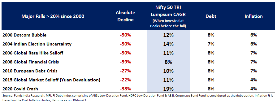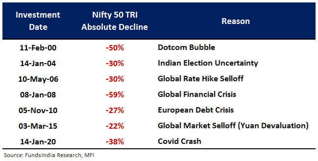 Check out the returns of lumpsum investments in Nifty 50 TRI till date when invested right before the major falls of the past two decades.