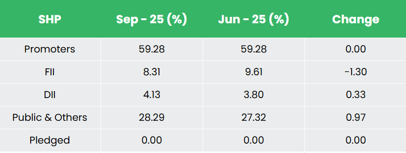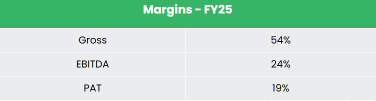 - Financial Performance – The 3-year revenue and net profit CAGR stands at 22% and 42% respectively between FY23-25. The company has a robust capital structure with a debt-to-equity ratio of 0.11. Average 3-year ROE and ROCE is around 23% and 28% for FY23-25 period.