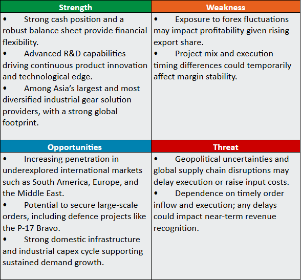- Strategic Focus on Export Expansion – The company aims to increase the contribution of exports to 50% of total revenue by 2030, reinforcing its long-term growth strategy through global diversification. While overseas business remained largely flat during Q2FY26 due to timing-related delays in order receipt and execution amid geopolitical uncertainties in select markets, the inquiry pipeline remains strong. The company expects a meaningful pickup in execution momentum in H2FY26 as conditions stabilize. The company’s export strategy focuses on expanding presence in underpenetrated regions such as South America, select European countries, parts of the Middle East, and the Far East, while continuing to strengthen its base in Europe and North America.
