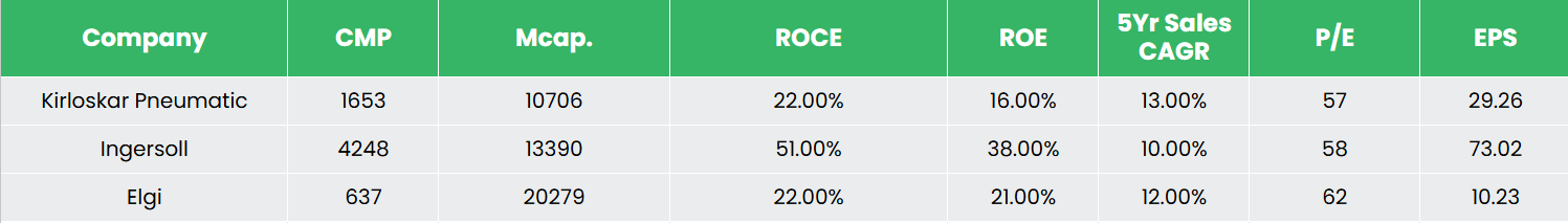 KPCL stands out as a fundamentally strong company, showcasing consistent revenue growth and robust returns on invested capital. Competing with industry players like Ingersoll-Rand (India) Ltd and Elgi Equipments Ltd, KPCL has solidified its position through steady financial health and strategic investments.