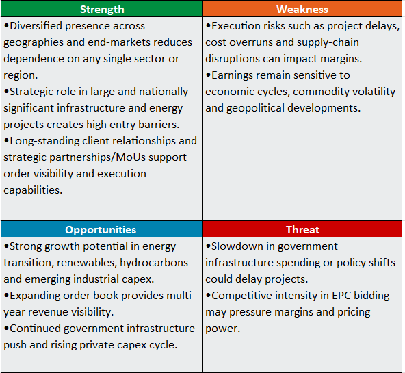- Strong domestic demand visibility – Highway construction, power capacity addition, and a Rs.11,21,000 crore FY26 infrastructure capex outlay are driving sustained demand for engineering and capital goods.