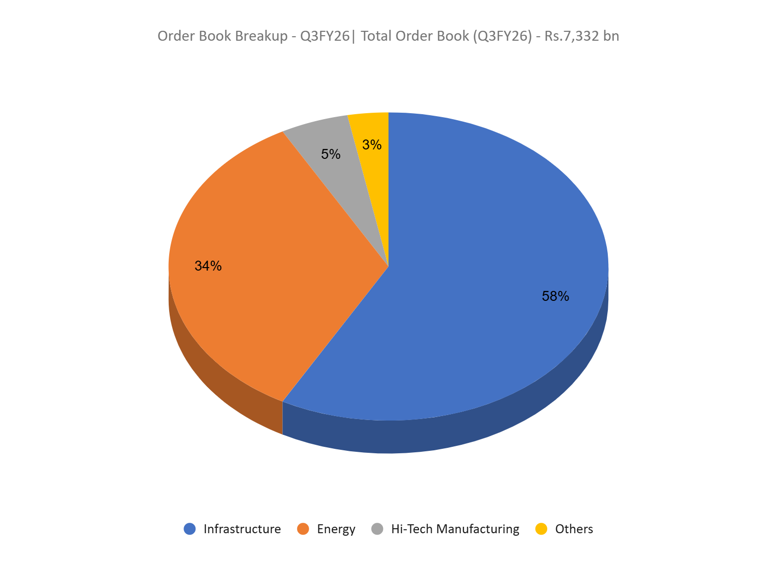 - Robust order inflows support earnings visibility – L&T reported its highest ever quarterly order inflow of Rs.1.36 trillion (+17% YoY) in Q3FY26, led by broad-based demand across India and overseas markets. The core Projects & Manufacturing (P&M) segment contributed Rs.1.16 trillion (+18% YoY) with domestic orders rising sharply 30% YoY, driven by hydrocarbons, buildings & factories and CarbonLite/energy transition opportunities, while international inflows grew a steady 7%. The near-term prospect pipeline expanded to Rs.5.92 trillion (+7% YoY) and the total order book surged 30% YoY to Rs.7.33 trillion translating into multi-year revenue visibility. Importantly, the mix is improving: private sector share increased to 36% (vs 21% in Mar-25), indicating an early private capex revival rather than reliance purely on government spending. Infrastructure and Energy together form ~92% of the book, while geographic diversification remains balanced (51% domestic / 49% international), reducing cyclicality risk.