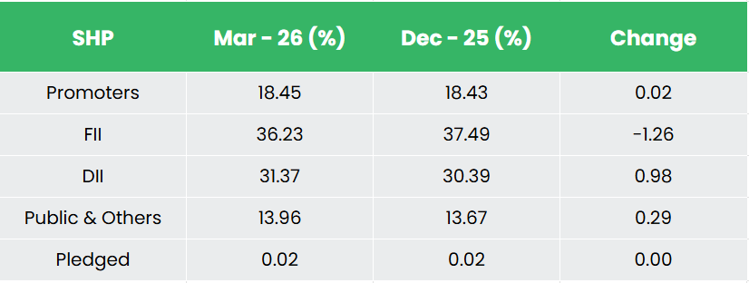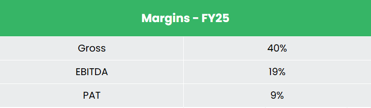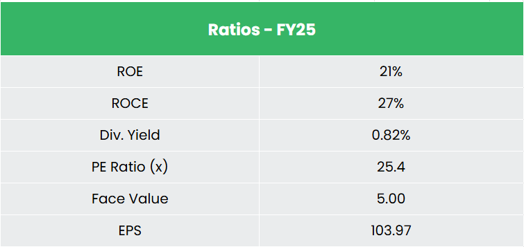 - Financial Performance – The 3-year revenue and net profit CAGR stands at 21% and 27% respectively between FY23-25. The company has a debt-to-equity ratio of 1.5x and the 3-year average ROE and ROCE are around 18% and 13% for FY23-25 period.