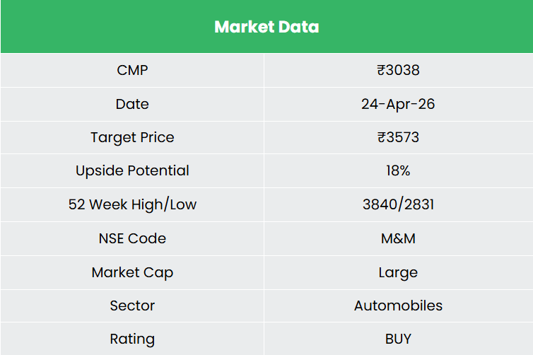 M&M’s auto demand outlook remains robust, underpinned by strong market acceptance of recent launches and a well-stocked product pipeline that provides clear volume visibility over our forecast period. We recommend a BUY rating in the stock with the target price (TP) of ₹3,573, 28x FY27E EPS. We also encourage maintaining a stop-loss at 20% from the entry price to manage potential downside risk effectively.