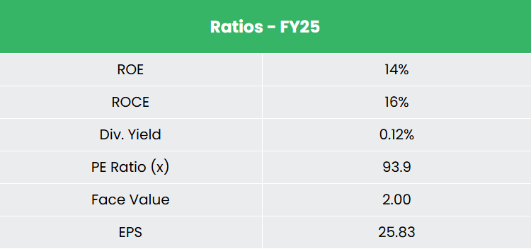 • Financial Performance – The 3-year revenue and net profit CAGR stands at 19% and 10% respectively between FY23-25. Notably, the TTM revenue and net profit growth have improved to 25% and 62%. The 3-year average ROE and ROCE are around 12% and 14% for FY23-25 period. The company has a robust capital structure with a debt-to-equity ratio of 0.21.