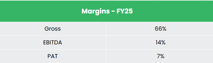 • FY25 – During FY25, the company generated revenue of Rs.4,843 crore, an increase of 18% compared to the FY24 revenue. EBITDA was recorded at Rs.674 crore, up by 33% YoY. The net profit grew by 32% to Rs.346 crore.