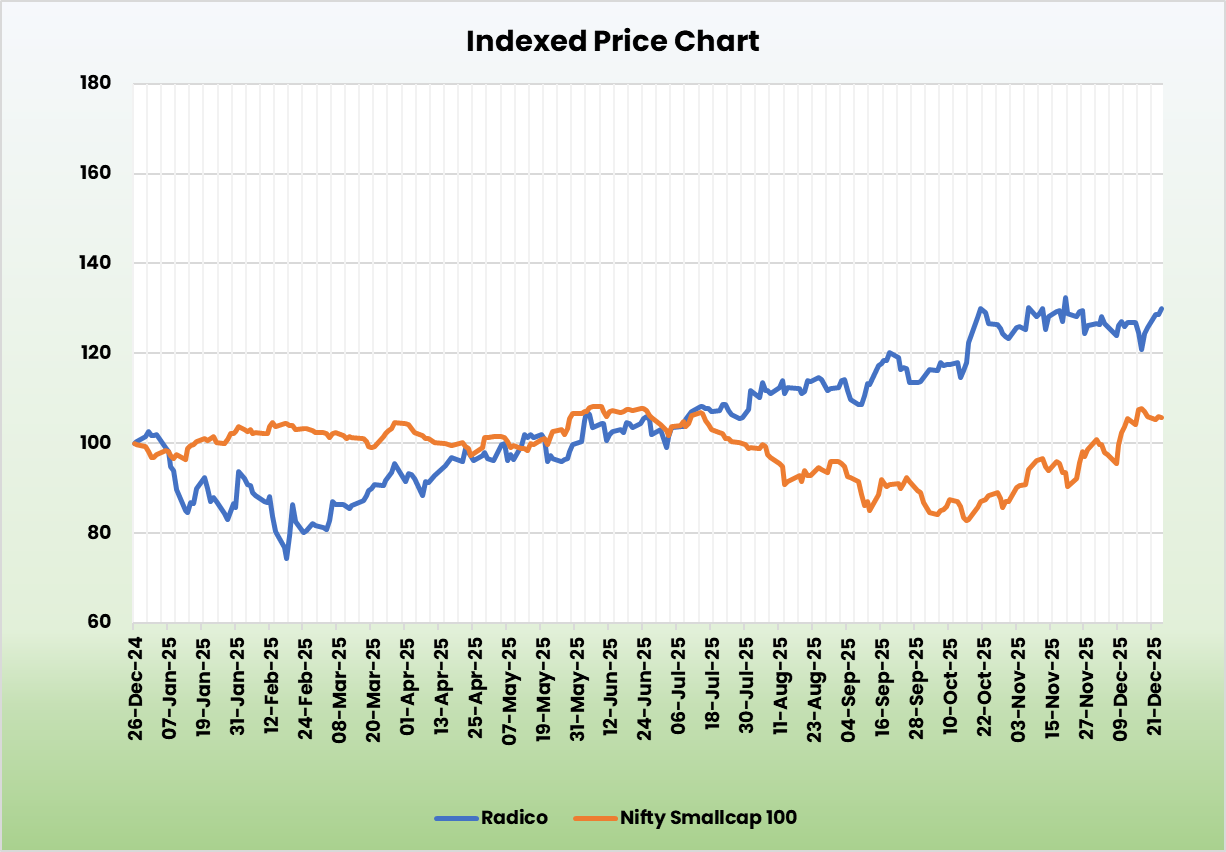 • Sitapur Capex Strengthens Supply Security and Margin Expansion – The company has completed a strategic capex cycle aimed at strengthening backward integration and supporting long-term growth in its branded spirits portfolio, led by the commissioning of the 350 KLPD grain-based ENA distillery at Sitapur, now operating at ~95% utilisation. The facility secures long-term ENA supply, reduces dependence on external vendors, and supports the company’s accelerating Prestige & Above (P&A) growth, where grain-based ENA is predominantly used. Alongside the Rampur campus, Sitapur is expected to meet branded business requirements for the next 6–7 years, while expanded packaging and PET bottle capacities further enhance operational efficiency. With the capex cycle largely complete, Radico is well positioned to drive premiumisation-led growth, margin expansion, and stronger cash flow generation, aided by a cost-efficient and sustainable energy mix at Sitapur, where the majority of power is generated through captive agro-waste–based sources.