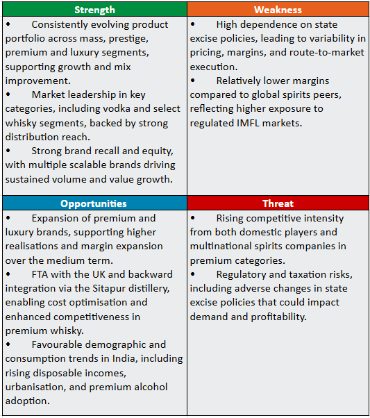 The company enters FY26 with strong growth visibility, supported by a well-established brand portfolio, improving execution, and consumer-led innovation. With the major capex cycle now complete, the company has sufficient capacity, scale, and integration to support sustained expansion, while management targets strong double-digit growth in the Prestige & Above segment and 20%+ overall volume growth in FY26. Stable ENA and grain pricing expectations, alongside favourable route-to-market changes and policies anticipated in major states, are likely to support profitability, with management guiding to 125–150 bps EBITDA margin expansion. Continued traction in luxury and semi-luxury offerings, with a targeted Rs.500 crore revenue opportunity, is expected to further strengthen earnings quality. Improved cash generation is anticipated to enable a debt-free balance sheet within the next two years, positioning the company for sustained free cash flow generation by FY27.
