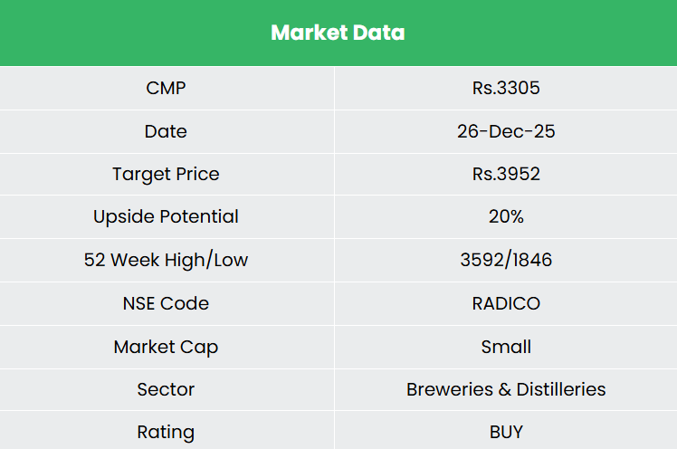 Supported by rising alcohol consumption, a strengthening festive demand cycle, evolving consumer preferences, improving route-to-market dynamics, and a structurally stronger balance sheet, we believe Radico Khaitan presents a compelling investment opportunity at this stage of its growth cycle. We recommend a BUY rating in the stock with the target price (TP) of Rs.3,952, 56x FY27E EPS. We also encourage maintaining a stop-loss at 20% from the entry price to manage potential downside risk effectively.