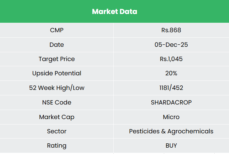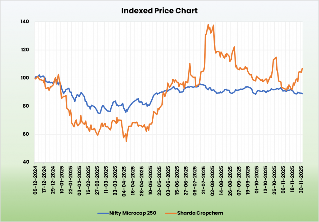 Sharda Cropchem Limited, incorporated in 2004 and headquartered in Mumbai, is a global, asset-light agrochemical company focused on marketing and distributing generic crop protection products across 80+ countries. Its portfolio spans fungicides, herbicides, insecticides, and biocides, supplemented by a non-agricultural business in belts, dyes and industrial chemicals. The company’s competitive strength is built on its regulatory portfolio of 2,994 product registrations and 1,068 applications under review, enabling scalable participation in regulated markets such as Europe, NAFTA and LATAM. Manufacturing is fully outsourced, ensuring flexibility and cost efficiency with a strong on-ground network of over 525 distributors supporting its Factory-to-Farmer distribution model.