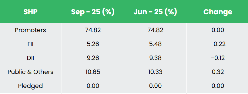 - Q2FY26 – During the quarter, the company reported revenue of Rs.929 crore, up 20% YoY compared to Rs.777 crore in Q2FY25, on account of a strong volume growth of ~35%. EBITDA rose to Rs.139 crore, a 71% increase from Rs.81 crore in the corresponding quarter. Net profit stood at Rs.74 crore, growing 75% YoY from Rs.42 crore in Q2FY25.