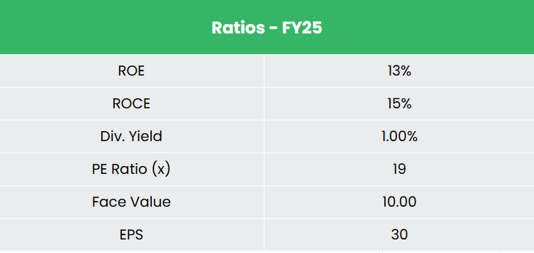 - Financial Performance – The 3-year revenue and net profit CAGR stands at 6% and -5% respectively between FY23-25. Notably, the TTM revenue and net profit growth have improved to 33% and 107%. The company carries no interest-bearing debt. The 3-year average ROE and ROCE are around 10% and 14% for FY23-25 period.