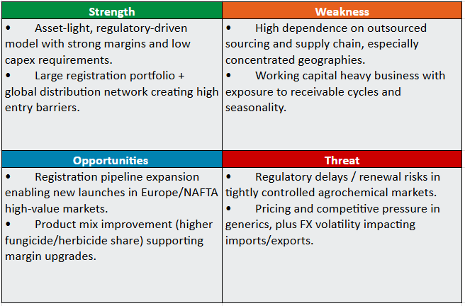 Management expects performance to improve in H2FY26, consistent with the seasonal uplift seen in the crop protection industry. Gross margins are expected to remain around 34 – 35%, supported by product mix optimization and pricing actions, while EBITDA margins are guided in the 15 – 18% range. The company continues to strengthen its regulatory pipeline, with Rs.450–500 crore in registration-linked capex planned for FY26 to drive future product approvals across key regulated markets. In the non-agro business, particularly conveyor belts with strong exposure to North America, the made-to-order model and ability to pass on tariffs provide margin resilience despite end-market volatility. Overall, the company is poised to sustain its growth momentum in the medium-long term.