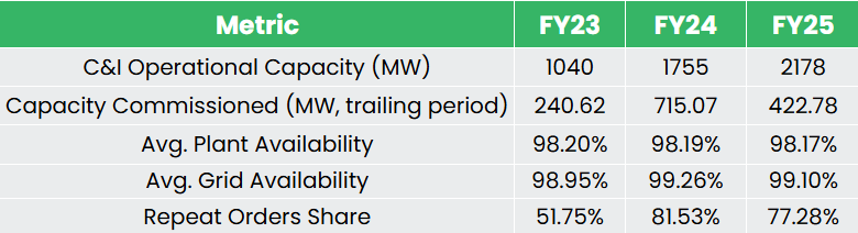 - Strong execution and asset reliability – CleanMax’s operational track record reflects consistent execution across commissioning, asset performance and customer expansion. The company has scaled its C&I operational capacity from 1,040 MW in FY23 to 2,178 MW in FY25, alongside commissioning 422.78 MW during the trailing twelve months ended FY25, indicating sustained execution momentum. Operational reliability remains strong, with portfolio-level plant availability maintained at approximately 98% and grid availability around 99%, supporting stable power delivery under long-term contractual arrangements. Additionally, repeat orders accounted for 77.28% of new contracted volumes in FY25, reflecting a meaningful contribution from existing customers to incremental capacity additions.