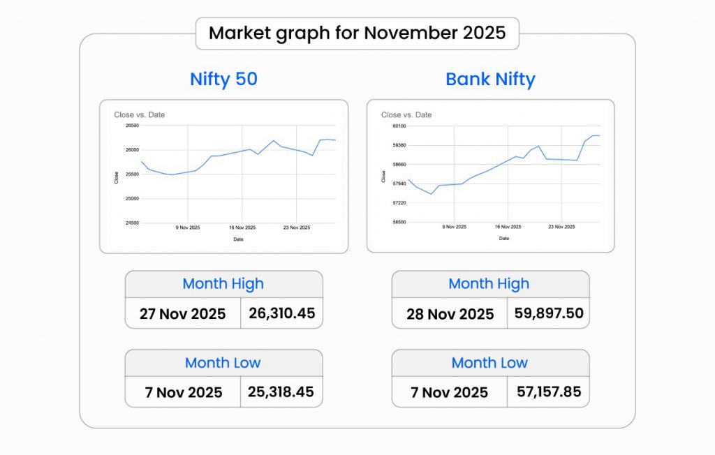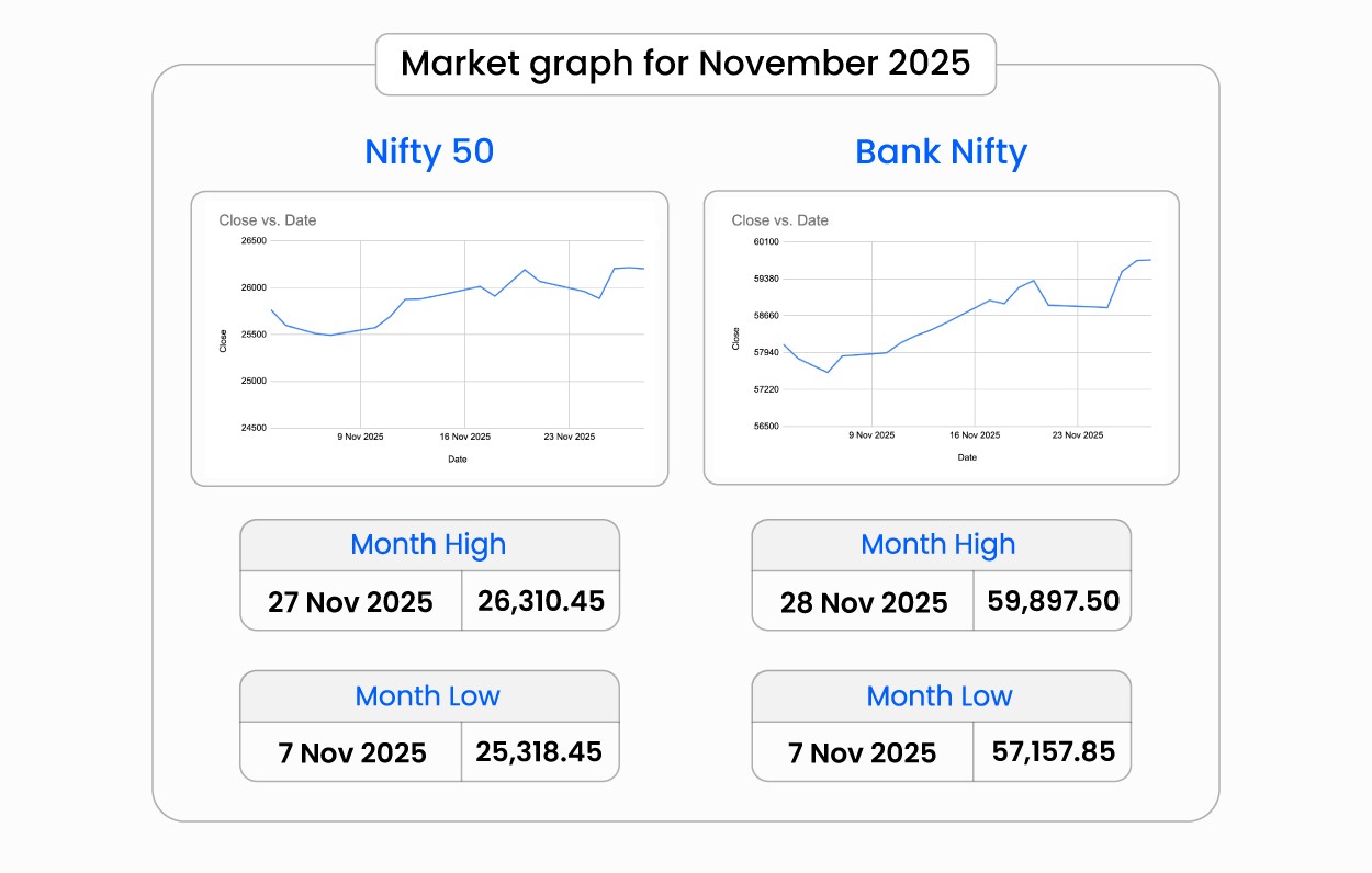 In November 2025, the Nifty 50 and Bank Nifty extended their winning streak for a third straight month, rising 1.87% (480 points) and 3.42% (1,976 points), with Bank Nifty outperforming. After a weak first week, Nifty closed the remaining three weeks in the green. Nifty tested 26,300 for the first time since September 2024, while Bank Nifty hit a new all-time high of 59,897.