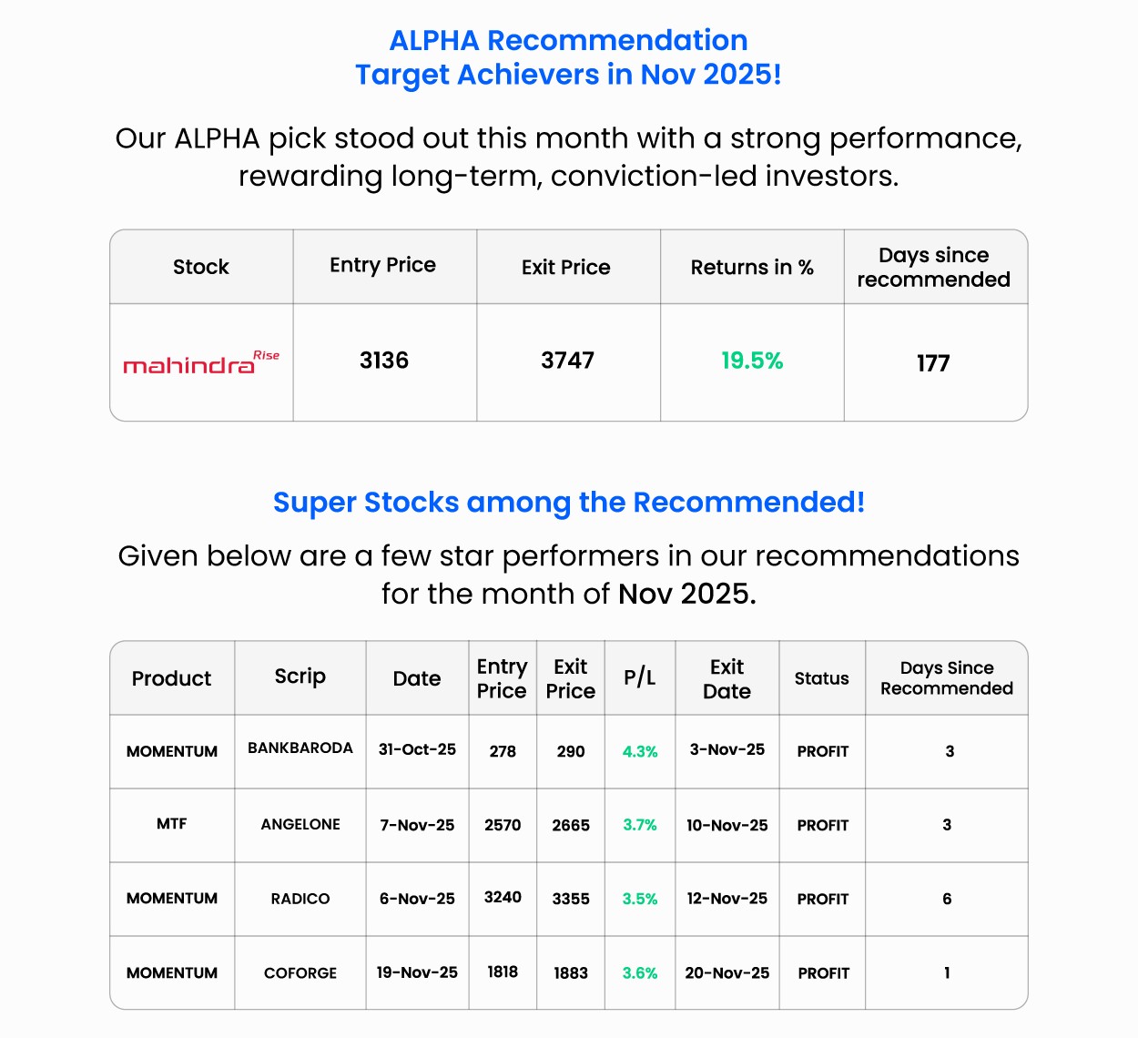 Market gains in November were supported by global rate expectations, strong domestic liquidity, and easing macro indicators. The latest data showed India’s GDP growing 8.2% in Q2 FY26, while CPI inflation for October dropped to a multi-year low of 0.25%, reinforcing confidence in the economic outlook. Despite persistent FII outflows of ₹17,500 crore, solid earnings from banks and IT and improving consumption trends kept sentiment firm, with DIIs more than offsetting foreign selling by infusing ₹77,084 crore. Sectorally, IT emerged as the top performer with a 4.74% gain, followed by PSU banks at 4.03%, while Media (-4.56%) and Realty (-4.69%) were the notable laggards.